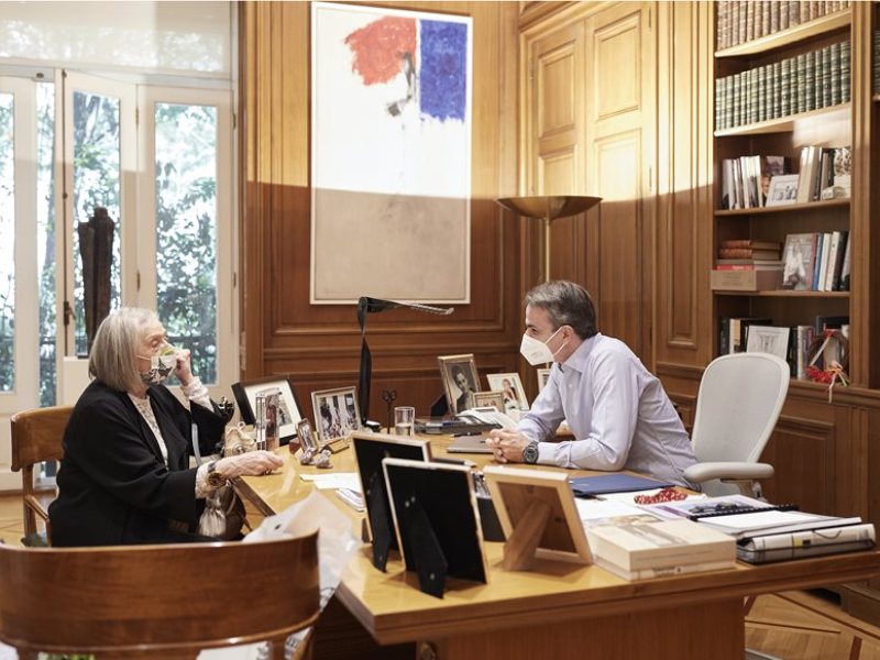 Στη συνάντηση ο Πρωθυπουργός συζήτησε μαζί της το θέμα του εμβολιασμού – η ίδια τον ενημέρωσε ότι έχει κάνει και τις δύο δόσεις του εμβολίου, με τον κ. Μητσοτάκη να την προτρέπει: «Παρά ταύτα να προσέχετε χωρίς υπερβολές. Νομίζω ότι είμαστε στο τέλος της περιπέτειας».